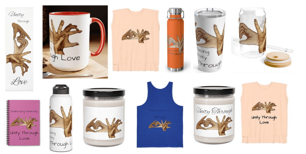 Introducing our ‘Unity Through Love’ collection, where original artwork featuring hands from people of different races spell out ‘Love’ in sign language. These products, including coffee cups, t-shirts, and yoga mats, serve as a reminder that despite our differences, love unites us all. Embrace diversity and spread a message of unity with every sip, stretch, and wear.